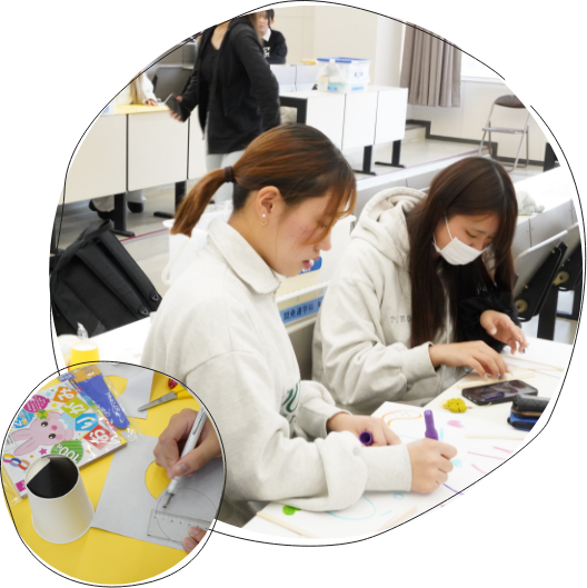 活動の中で、「自分で考えて行動する力(主体性)」、「友だちや子ども、先生と協力して進める力(コミュニケーション力)」、「問題に気づき、解決しようとする力(問題解決力)」を身につけていきます。将来、保育や教育の現場で積極的に考え、行動できる先生になるための学びです。