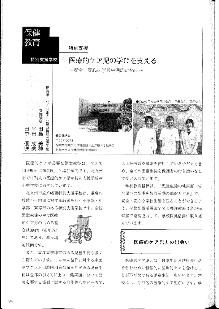 この冊子には、毎月、小学校や中学校といった校種それぞれの保健教育の実践を紹介する特集コーナーがあり、この5月号において『〈特別支援学校〉特別支援医療的ケア児の学びを支える~安全安心な学校生活のために~』と題して、北九州市立八幡西特別支援学校における取り組みが、同学校の養護教諭3名により、執筆、掲載されています。